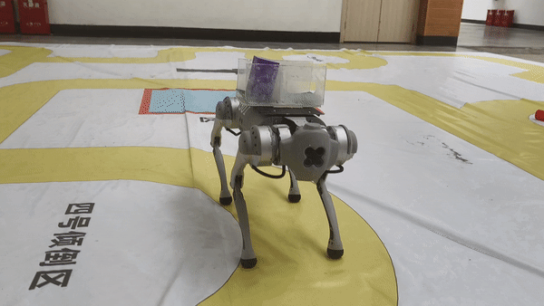 本次挑战赛采取A组和B组1VS1对抗模式,一共进行4轮比赛。按照比赛要求,参赛者需控制机器人从启停区出发,沿着黄色道路运行,经过岔路口等干扰,将机器人背部负载的两个物资分别倾倒在对应卸货区域内,最后返回启停区卧倒,限时3分钟。比赛全程在6米×7米地图上实施,以睿抗机器人开发者大赛规则作为评分标准。比赛极大考验了战队队员对四足机器人的操纵控制能力,为进一步优化视觉及运动控制算法奠定基础。最后,经过激烈的比拼,4位同学获得优胜奖。