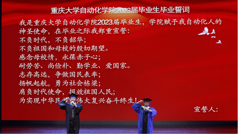 员工代表满石林、胡锦程带领全体毕业生宣读了毕业誓词。铿锵语句表达了自动化学子不负韶华、不忘初心、肩负时代使命、报效国家的远大目标。