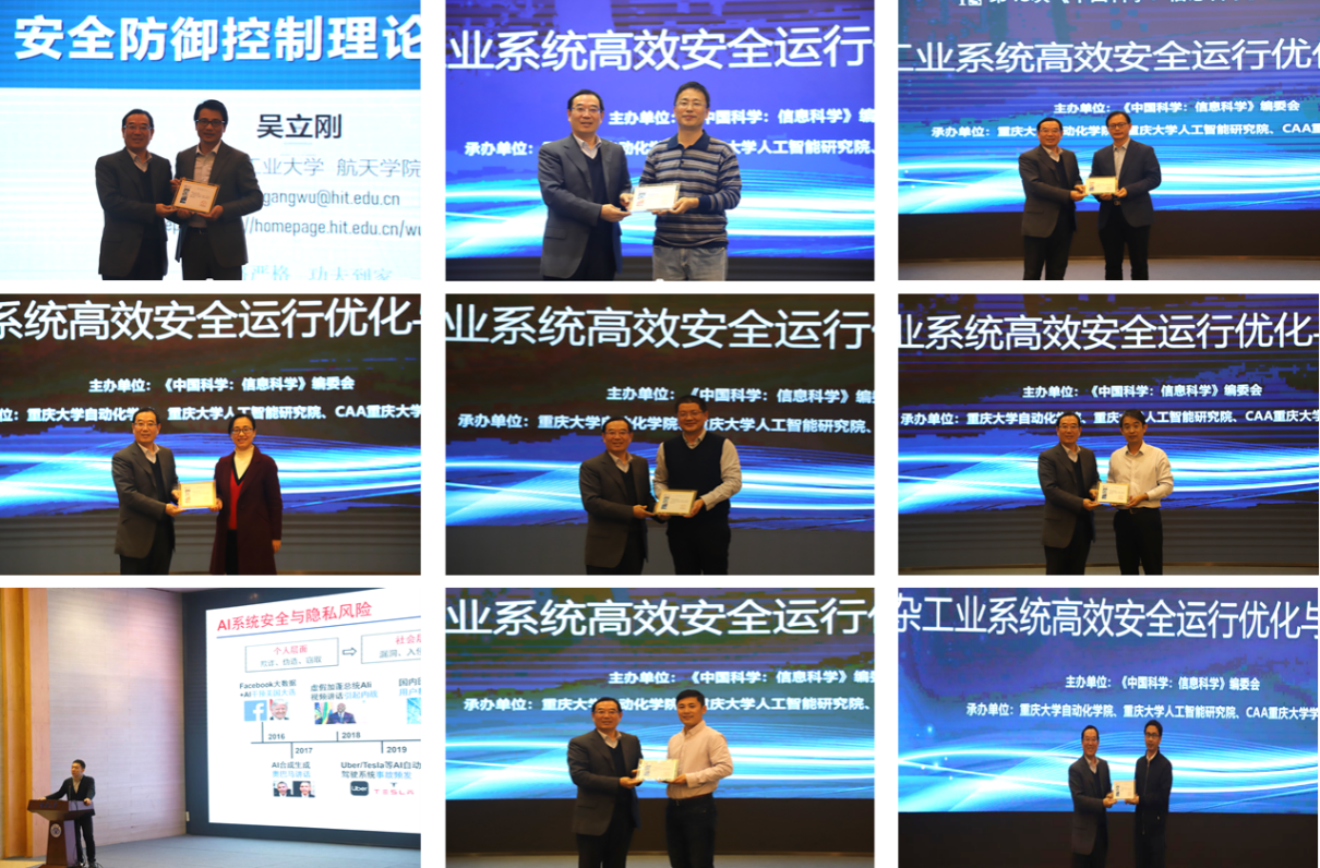 本次学术沙龙围绕“复杂工业系统高效安全运行优化与智能控制”展开,共9位国内知名学者作了精彩的学术报告,哈尔滨工业大学吴立刚教授、华东理工大学钟伟民教授、南京航空航天大学陈谋教授、中南大学王雅琳教授、北京工业大学韩红桂教授、北京理工大学孙健教授、西安交通大学沈超教授、上海交通大学朱迎善教授、中国科学院自动化研究所李国齐研究员分别作“信息物理系统安全防御控制理论与方法”“城市污水处理过程异常工况预警与自愈控制”“异类逼近器耦合协同设计与抗扰控制综合技术”“盐湖化工智能制造关键技术研究与应用实践”“家电产品回收拆解再利用全流程智能管控”“网络化系统安全控制”“大模型系统可信安全与测试”“工业网络系统感知-控制联合设计及优化” “类脑计算智能”等邀请报告。张纪峰代表《中国科学:信息科学》编辑部给报告人颁发了期刊特邀报告人纪念证书。