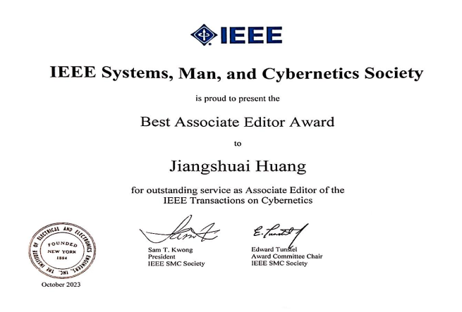 2023年10月3日,IEEE系统、人、控制论学会(IEEE Systems, Man, and Cybernetics Society,IEEE SMC)举行2023年度学会颁奖仪式。70net永乐高黄江帅教授作为IEEE控制论学报副主编因对学会做出杰出贡献荣获IEEE SMC学会Best Associate Editor Award,该奖项在全球范围内遴选,其中期刊IEEE Transactions on Cybernetics每年仅一人获奖。