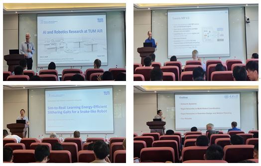 Alois Knoll教授作了主题为“Advancing Technology Frontiers: Exploring the Technical University of Munich and the Chair of Robotics, Artificial Intelligence, and Real-Time Systems”主题报告,并介绍了慕尼黑工业大学的建校历史,机器人、人工智能与实时系统学院,以及教授所在团队正在开展的系列重大科研项目;Florian Walter教授在报告中强调了在模拟中进行的虚拟实验如何能够有效地设计机器人的神经形态感知和控制算法;Zhenshan Bing研究员对蛇形机器人的发展与运动控制做出了分析,重点介绍了蛇形机器人的进化发展,以及基于中心模式生成器(CPG)和强化学习概念的运动控制算法;井冈山教授就“Network-Based Robotics Control and Motion Planning”报告了最新研究进展,并简要讨论了网络系统和机器人交叉点的热门话题。会上,师生踊跃提问,并与学者展开积极交流,讨论氛围十分热烈。