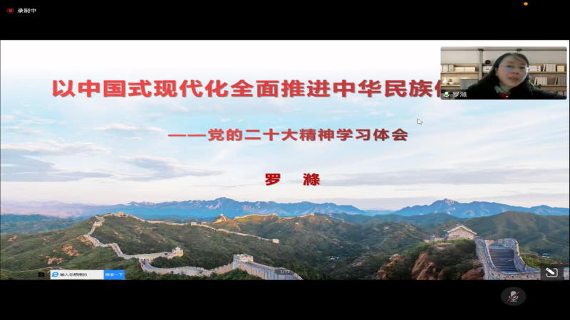 罗滌从党的二十大会议召开的概况及其背景、新时代十年的伟大变革和历史性成就、开辟马克思主义中国化时代化新境界、新时代新征程中国共产党的使命任务、新时代新征程的重要部署和战略举措等五个方面进行宣讲。她以党的二十大的主题为切入点,结合国际国内形势,通过鲜活的事例,围绕大会议程、大会主题和报告内容等进行详细讲解。在讲到新时代十年的伟大变革时,她结合优秀共产党员毛相林的事迹详细生动地说明了脱贫攻坚成果来之不易,十年来我们取得的成就来之不易。罗滌强调要学深悟透习近平新时代中国特色社会主义思想,牢记新时代新征程中国共产党的使命任务,以中国式现代化全面推进中华民族伟大复兴。