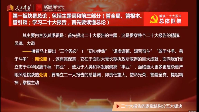 王杰教授带领大家学习了党的二十大报告的总论,总结了过去五年的工作和新时代十年的伟大变革,提出了二十大报告的主题和“三个务必”等内容。他全面解读了“文化自信自强”的内在涵义,助力广大党员深入理解从“文化自信”到“文化自信自强”的内在逻辑,深入领会文化自信自强的强大精神力量,牢牢把握社会主义文化建设的正确方向,以高度的政治责任感和时代使命感,落实好报告部署的重点任务,在中国特色社会主义文化发展道路上激发全民族文化创新创造活力,建设社会主义文化强国。