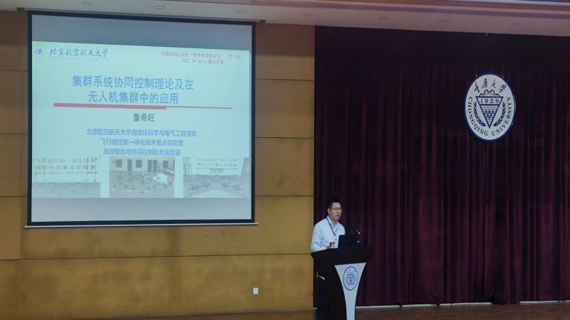 北京航空航天大学董希旺教授带来了“集群系统协同控制理论及在无人机集群中的应用”的报告分享。他的报告主要针对集群系统协同控制中的分布式时变编队控制技术、编队跟踪控制技术及编队-合围控制技术进行分别介绍,并结合在无人机集群上的系列飞行试验对所提出技术的有效性进行演示验证,最后以所参加的空军“无人争锋”智能无人机集群系统挑战赛密集编队穿越竞速的比赛为例进行应用展示,并对未来的可能发展方向进行概述。