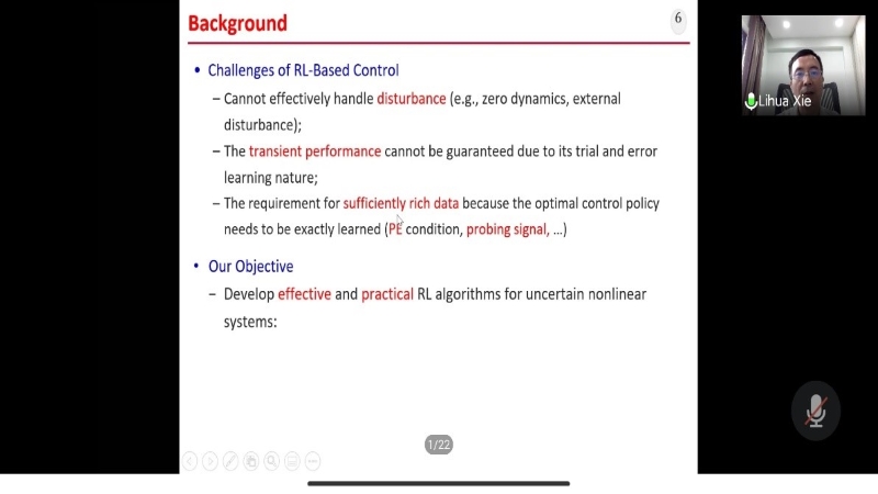 本次讲座谢立华教授讨论了应用于已知非线性性质的未知非线性系统的基于强化学习的自抗扰控制。首先设计一个扩展状态观测器,用于估计系统的状态和整体不确定性,控制律根据状态观测器的输出实时补偿系统整体的不确定性,同时通过基于强化学习技术的经验模拟,在线近似补偿后系统的最优化控制策略,这种方法不依赖过程电子条件或探测信号。谢立华教授将该研究延伸至完全未知的非线性系统,开发了一种新型实时自适应扩展状态观测器用于估计系统的参数和状态,并使用基于强化学习的经验模拟来近似最优策略。
