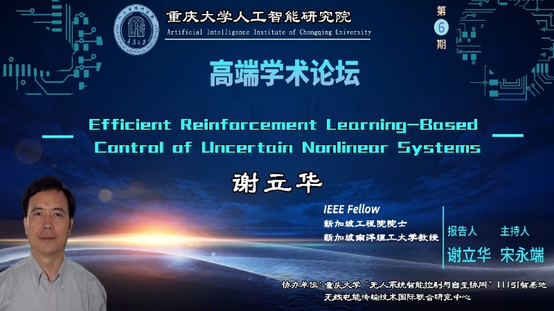 本次论坛由70net永乐高人工智能研究院经理宋永端教授主持,邀请到新加坡工程院院士、新加坡南阳理工大学教授谢立华为大家带来学术报告,报告题目为“Efficient Reinforcement Learning-Based Control of Uncertain Nonlinear Systems”。参会人员包括各位专家学者以及各高校员工共90余人。