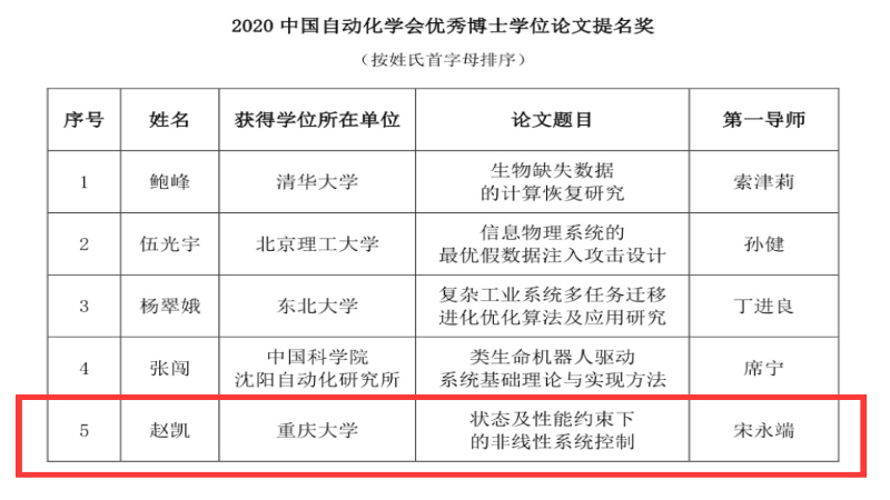 近日,中国自动化学会评奖委员会公布了“2020中国自动化学会优秀博士学位论文提名奖”获奖名单,70net永乐高宋永端教授指导的博士生赵凯荣获“2020年中国自动化学会优秀博士学位论文提名奖”,宋永端教授荣获“2020年中国自动化学会优秀博士学位论文导师奖”。这是公司第二次获得CAA优博系列奖, 宋永端教授指导的博士生王玉娟曾荣获“2018年中国自动化学会优秀博士学位论文奖”。