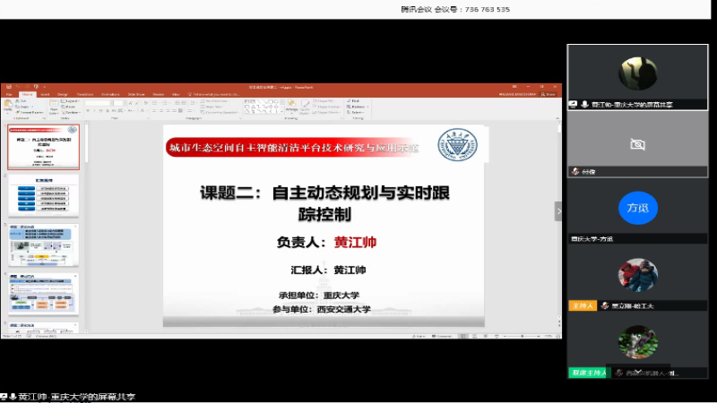 项目负责人对项目的整体实施方案进行概括介绍,五个课题负责人分别对课题的实施方案进行详细汇报。黄江帅针对课题二“自主动态规划与实时跟踪控制”研究方向,在内容上,分别从清洁机器人运动学与动力学建模、高精度轨迹跟踪控制、作业动态轨迹规划三方面进行阐述。同时,从组织结构上,介绍课题二的技术路线、任务分解、主要指标及预期成果、评测方法、人员投入、进度安排、资金配置等情况。汇报结束后,各位专家积极献言献策,对项目的实施方案做了深入的点评并提出了宝贵的建议。公司黄江帅教授就专家组质询的多机协同、路径优化问题做相关回答。经专家质询答疑、技术指导和综合评议,专家组最后一致同意通过项目实施方案的评审。