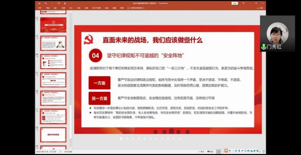 此外,支部书记门秀红同志还强调,通过本次疫情,我们应当审视自己对待世界和他人的态度,坚定忠诚奉献,弘扬革命先辈迎难而上革命精神;扩展生命认知、实现人与自然和谐发展;学思践悟、结合战疫实践提升理论修养。