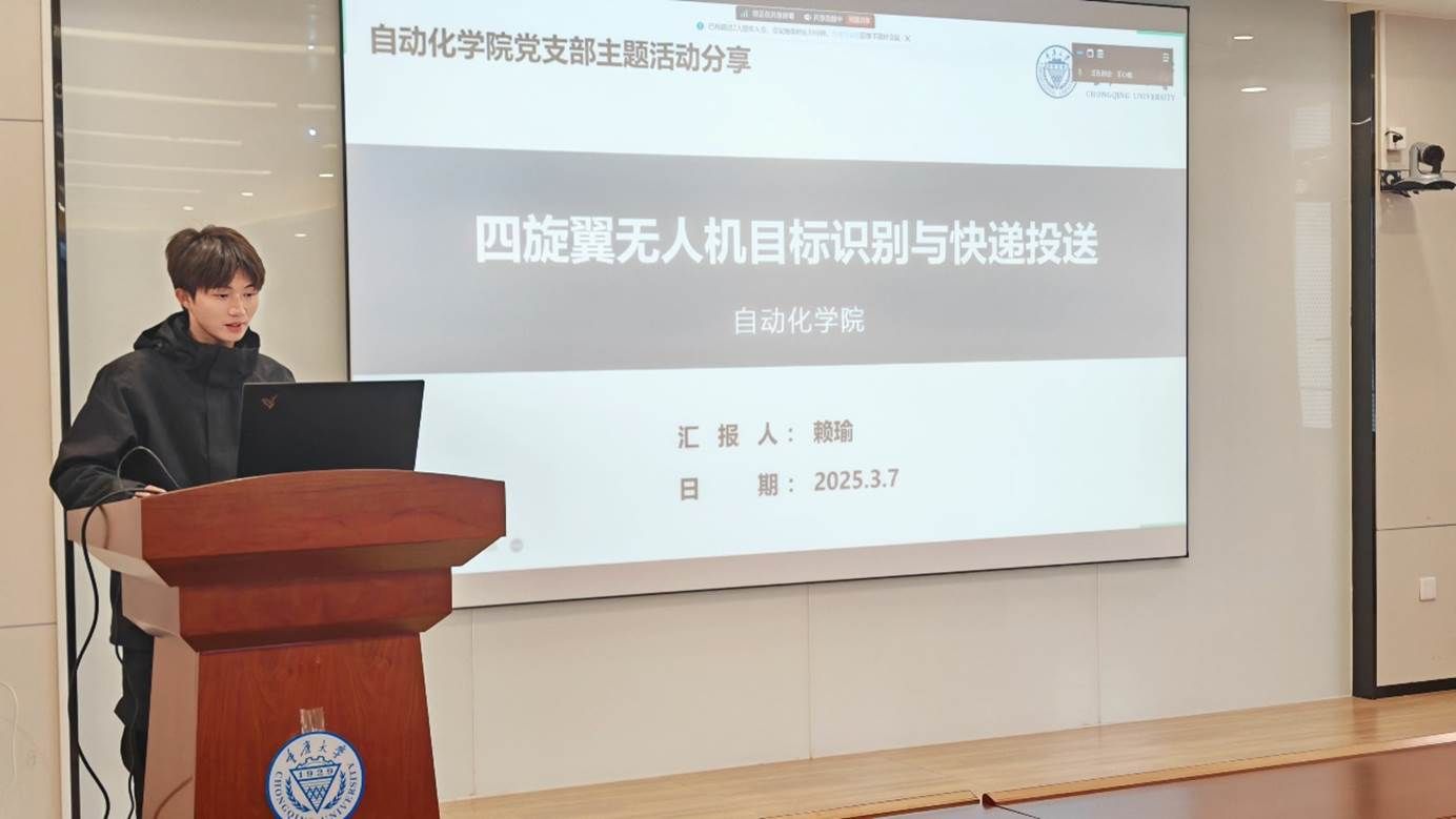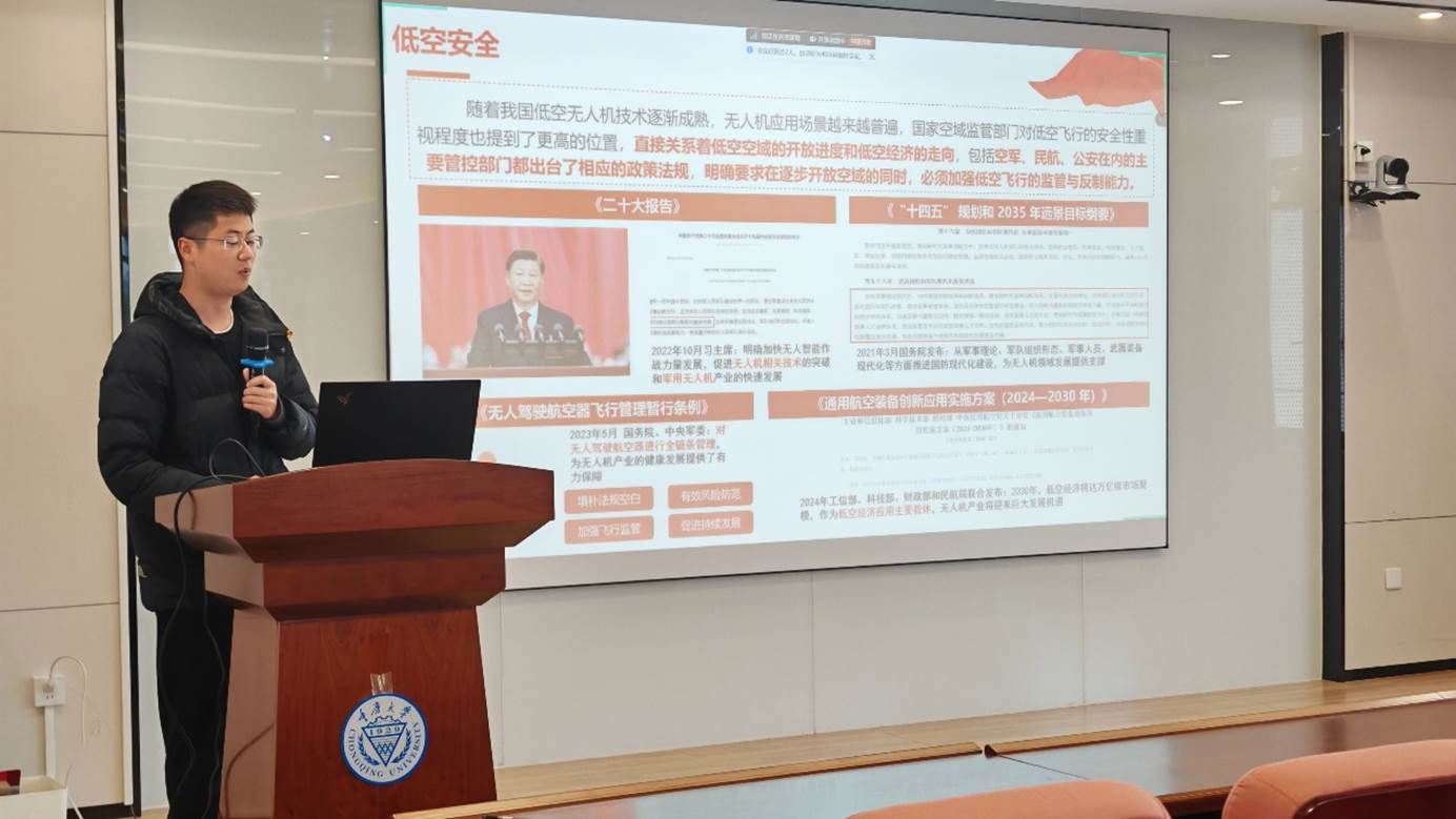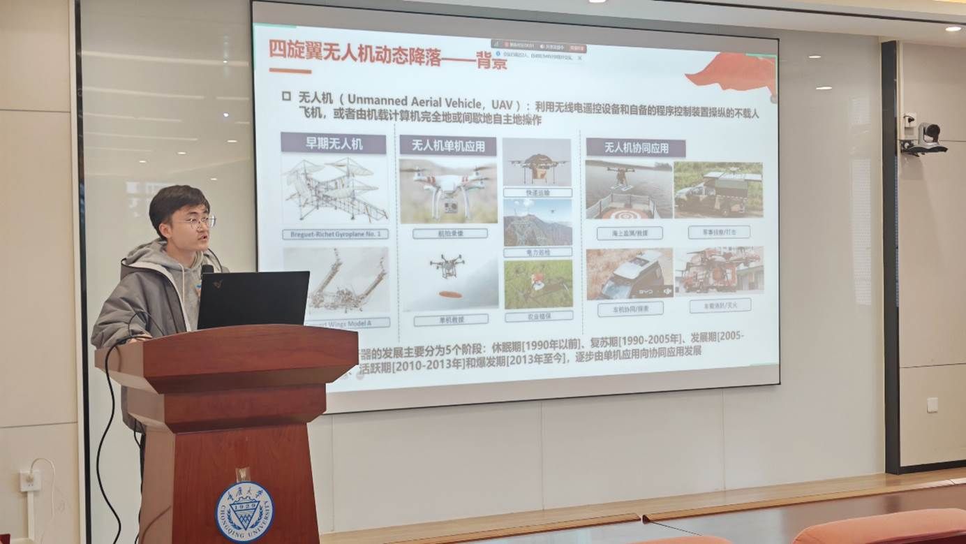 机器人智能第一党支部的张豪、丁鑫进行了《无人机特技飞行与动态回收控制》主题分享,深入探讨了在我国低空经济不断向好发展的背景下,无人机领域迎来的机遇与各项技术亟待突破与探索的挑战,并展示了无人机执行高机动性特技飞行任务与完成任务后进行动态回收任务相关的科研成果与工程实践,为低空安全防御提供了新的思路和技术支持。