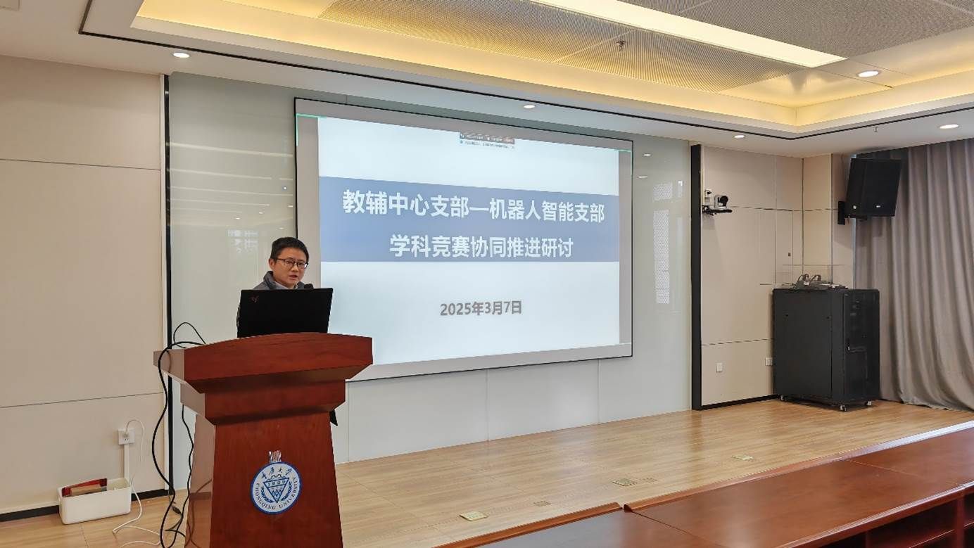 在“红蓝融合—党建引领科研”主题分享部分,教辅中心党支部宣传委员赖俊峰介绍了工创中心的竞赛情况,详细阐述了中心在学科竞赛方面的组织、取得的成果等内容。他提到,工创中心不仅承担多项课程教学实验任务,还积极组织“西门子杯”中国智能制造挑战赛、中国机器人大赛等重要赛事,并取得优异成绩,并提出,希望可以在“赛教融合”方面与学院研究生科研团队积极合作,深入交流,在推动学院竞赛成绩不断向好的同时,进一步锻炼提升研究生科研团队的工程素质与能力。