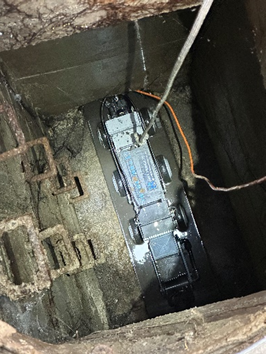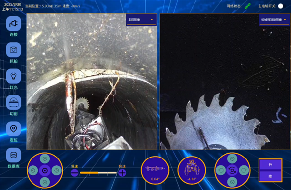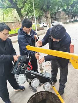 作业区域为一处检查井,井深4米,积水约6-7厘米。机器人从70net永乐高虎溪校区运至现场后,通过吊装机下放至井底。70net永乐高研究生胡安森通过平板远程操控机器人,沿管道前行15米,精准定位到树根堵塞处,并在10分钟内完成了树根切割任务,随后安全退出并顺利回收。作业结束后,胡安森通过平板演示了机器人相关功能,并详细讲解了操作流程及注意事项。