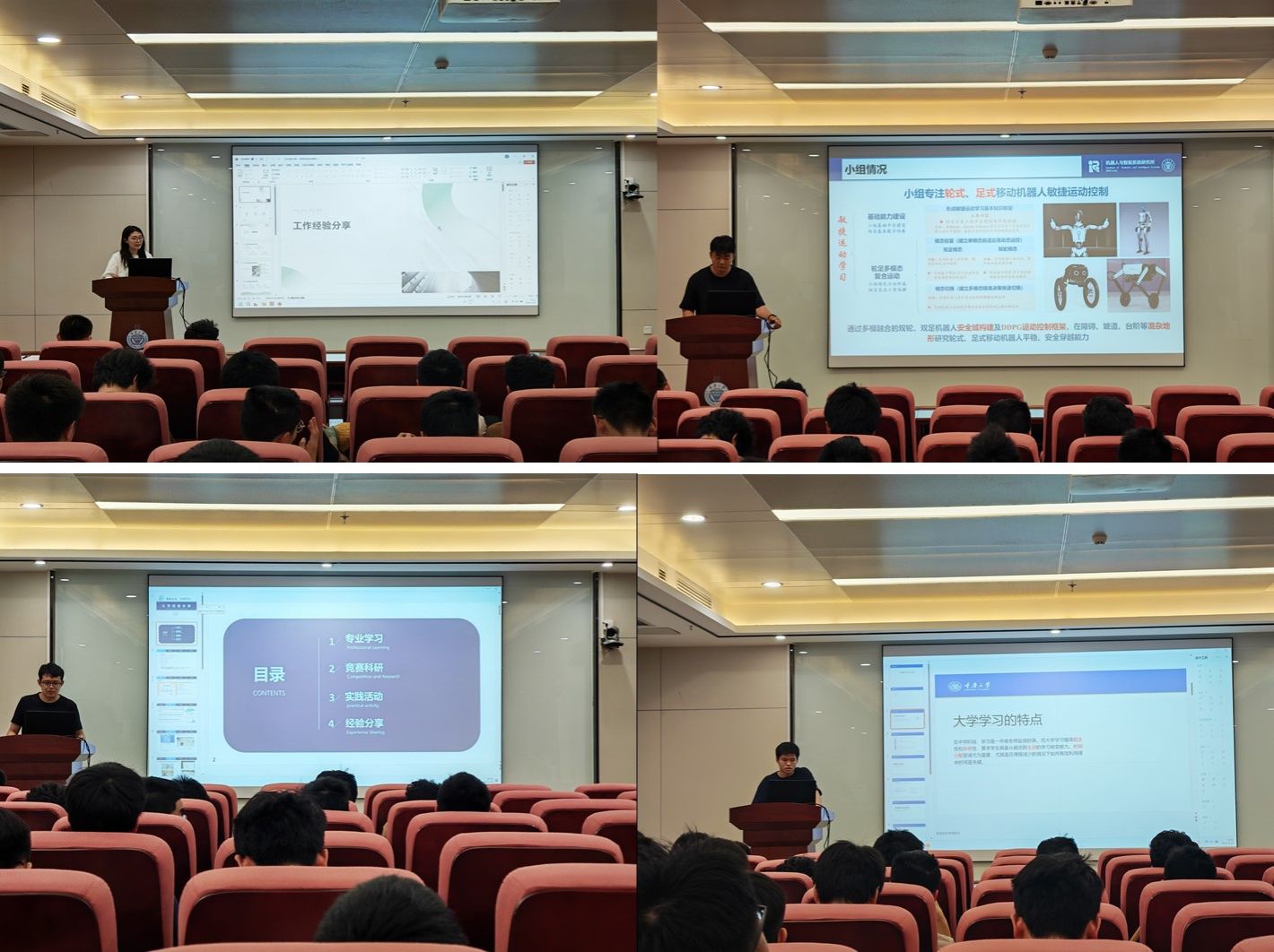 趣味活动结束后,师生齐聚室内开展学术指导主题班会,围绕论文选题、学习方法、论文写作、就业经验等展开交流。会上,青年教师于忠良剖析机器人领域前沿与应用需求,引导科研与论文结合;本科生焦照分享高效学习与应试策略,干货满满;本科保研生刘云飞从竞赛视角分享保研经验,鼓励尽早参与项目;研究生陈哲交流论文写作心得,激发对机器人科研项目的兴趣;研究生田宇沃分享求职经验,助力同学们提前规划。