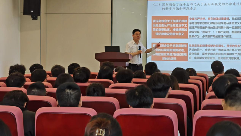 在主题党课环节,林景栋为与会人员讲《深入学习贯彻《条例》 切实增强“四个定力”》主题党课。在讲授环节,林景栋从深刻认识加强党的纪律建设的重要意义、准确把握《条例》修订的主旨要义和深化纪律教育切实增强“四个定力”三个方面进行讲解。他指出,加强纪律建设是我们党的光荣传统和独特优势,我们要深刻领会习近平总书记关于全面加强党的纪律建设的重要论述的科学内涵和实践要求,深化对加强党的纪律建设重要性的认识,不断提高政治自觉、思想自觉、行动自觉,切实增强纪律意识、提高党性修养,增强政治定力、纪律定力、道德定力、抵腐定力,为加快推进学院和学校高质量提供坚强纪律保障。